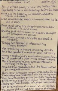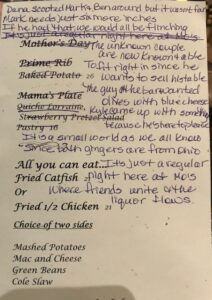 Scene opens with a door bell ringing. Lights come up on the Grace’s living room. Paul is standing at the door delivering pizza to the Graces. Mari Grace answers the door. Christmas music is playing in the background.